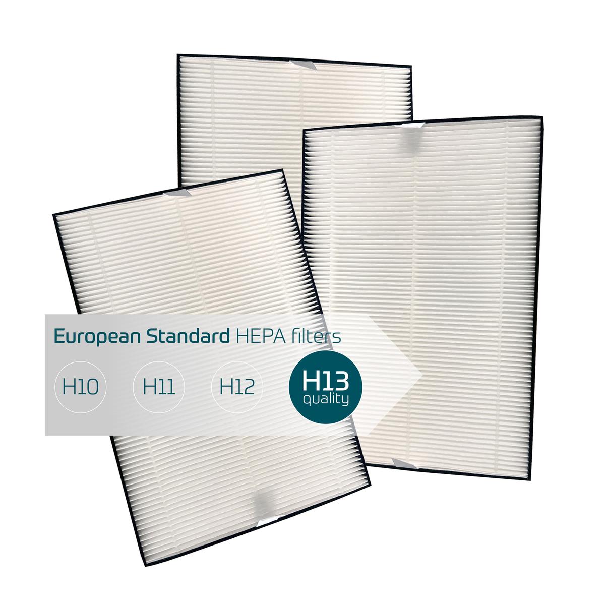 Der HEPA H13-Filter ist hocheffizient und filtert beeindruckende 99,97 % aller Partikel in der Luft, die größer als 0,3 Mikrometer sind - im Vergleich dazu sind Bakterien in der Regel zwischen 1 und 10 Mikrometer groß.